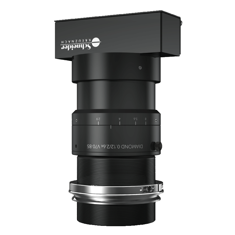 12k/ 5μm (DIAMOND XL: 16k / 5 μm) ラインスキャンセンサー用に最適化された高倍率レンズですが、16k/3.5μmラインスキャンセンサーや最大82mm対角のエリアセンサーを備えた多くのアプリケーションにも使用可能です。2.6倍から5.2倍の特定の倍率に最適化されており、コンパクトで堅牢なパッケージで高性能を実現します。V70/V90マウントインターフェースにより、多数のマウントを簡単に取り付けることができ、レンズを最適な方位に回転させることができます。